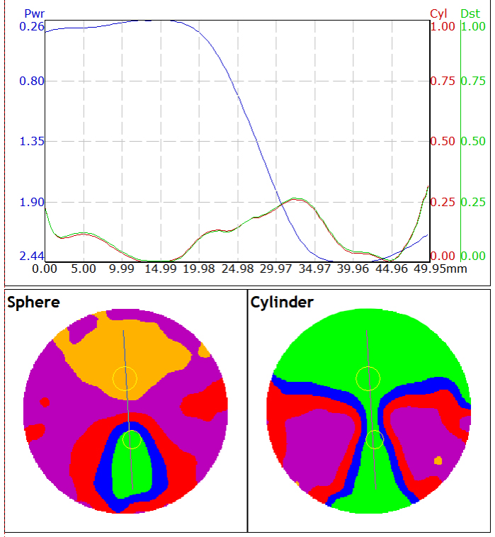 ● 采用復合平衡優(yōu)化技術:對不同區(qū)域進行針對性功能側重設計,經(jīng)多次迭代平衡后融入整體,克服了以往軟設計或硬設計不能同時兼顧視野開闊、過渡柔和、閱讀區(qū)加光不穩(wěn)定的缺點;在保持遠、近用區(qū)相對開闊穩(wěn)定的同時將盲區(qū)最大散光控制到了加光的90-93%之間。